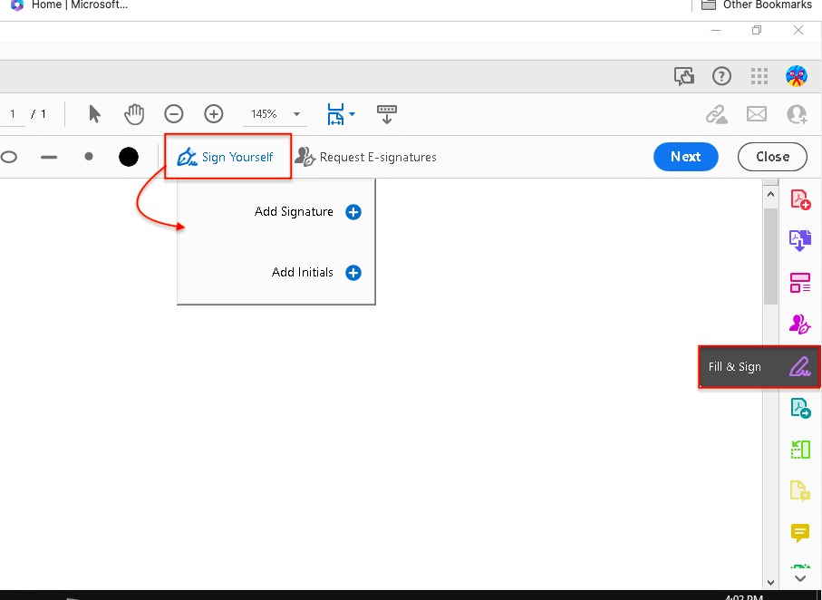 - Click the “Sign Yourself” button on the toolbar and select “Add Signature” to add your signature to Adobe Acrobat Pro DC.