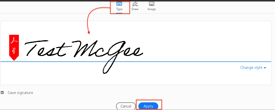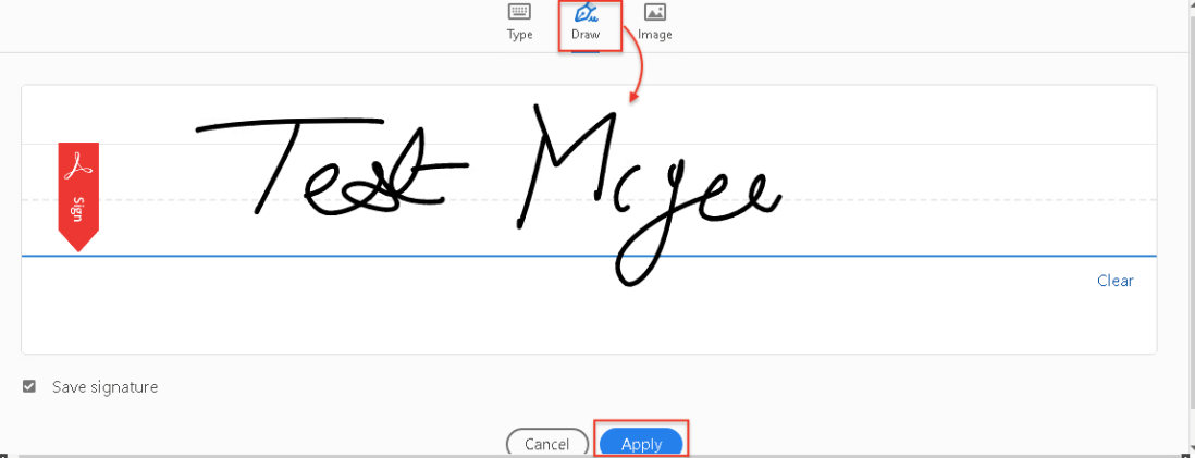 Third way, you can also select “Image” if you’d like to sign a piece of paper, scan it with a scanner, and then add your written signature to Adobe. - After creating a signature, click “Apply” to apply it to the document.