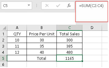 - Syntax: "=SUM(C2:C4)"