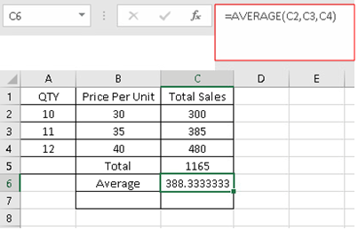 - Syntax: “=AVERAGE(C2, C3, C4)”