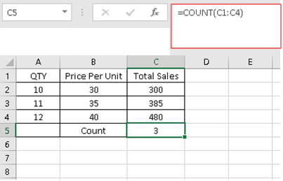 - Syntax: "=COUNT(C1:C4)"