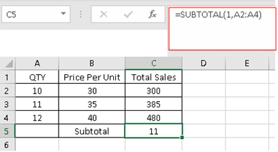 - Syntax: “=SUBTOTAL(1, A2: A4)"