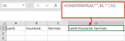 - Syntax: "=CONCATENATE(A1, " ", B1, " ", C1)"