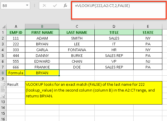 - Syntax: " =VLOOKUP(lookup value, range containing the lookup value, the column number in the range containing the return value, Approximate match (TRUE) or Exact match (FALSE)) ".