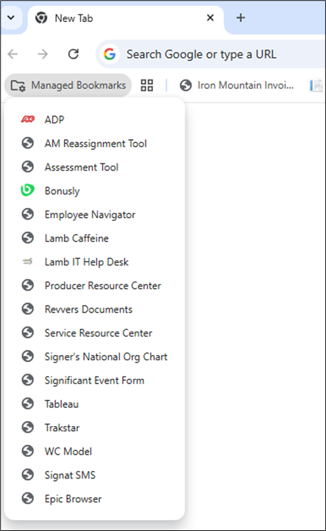 • Open your browser (Microsoft Edge, Google Chrome, etc) and look directly under the URL bar. This is where you will find Managed Bookmarks.