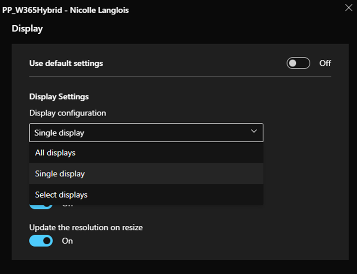 • The Windows 365 app's display settings are applied before initiating a session. Changes made during a session won't take effect until you reconnect.